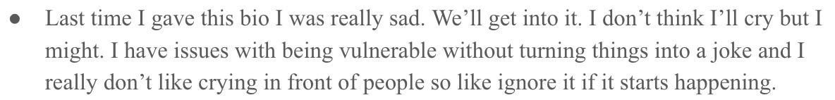 This week, I’m remembering that making a bio can be quite a traumatizing process. Reliving, remembering, and rehashing a lot of the hard parts of life is not easy. The first time I made my bio, it sent me into a frenzy about the kind of person college was making me. I felt I was losing my competitive spirit and my ability to lead. I wasn’t the person I knew anymore; I was just some degenerate getting drunk with strangers in a basement every Thursday night. It made me feel so awful that I remember biting my tongue through my entire bio so I wouldn’t break down and cry.